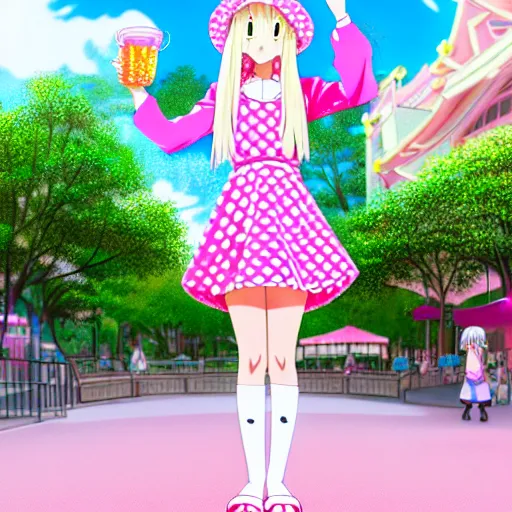 anime girl with long blonde hair with pink tips, wearing pink dress, pink flip flops, and a pink bucket hat with white polka dots, disneyland background, anime key visual, kyoto animation