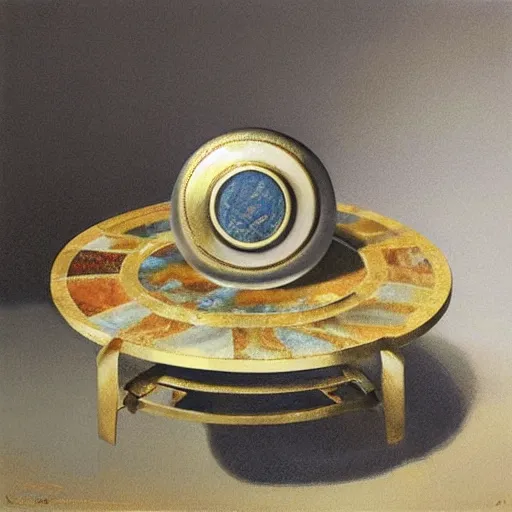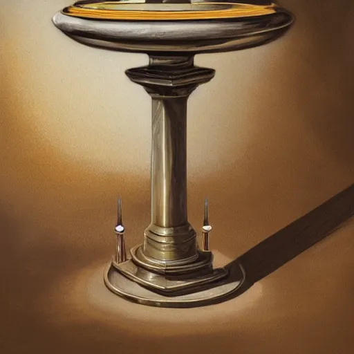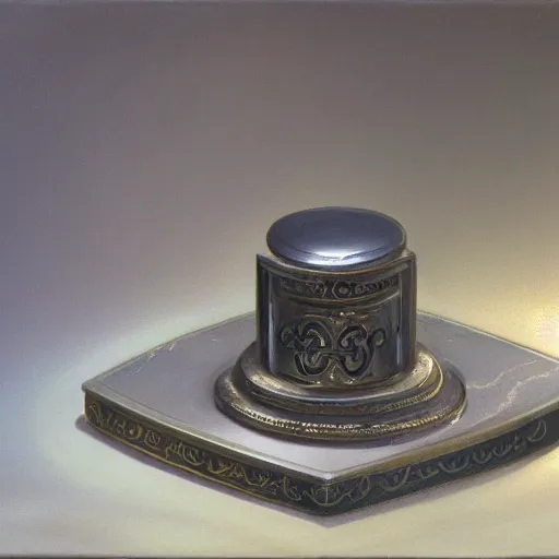 in the center lays an ancient chromed artifact in the shape of a heavy signet ring, ornate with g...Show more