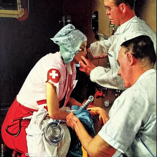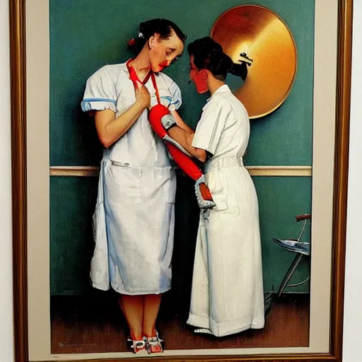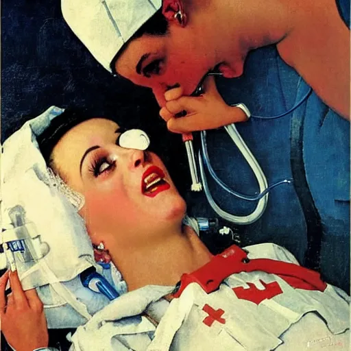 katy perry as a nurse, she is giving a patient mouth to mouth resuscitation, oil painting by norman rockwell,