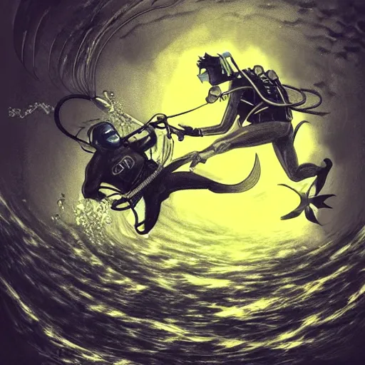 old drawing of a scuba diver fighting against a kraken underwater, under water scenery, dramatic lighting, intense, epic, drawing