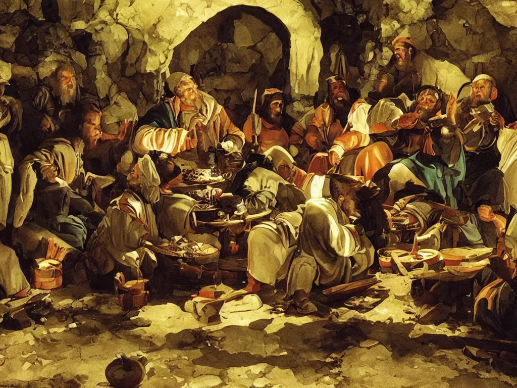 dwarves having a feast in moria, ferns. painting by georges de la tour