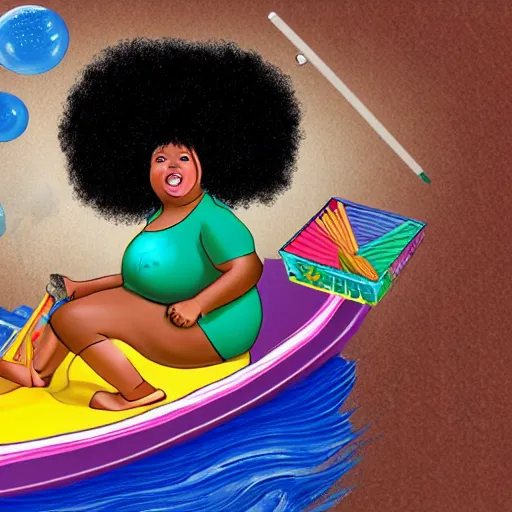 a fat girl with a big afro sitting in a boat who is eating crayons