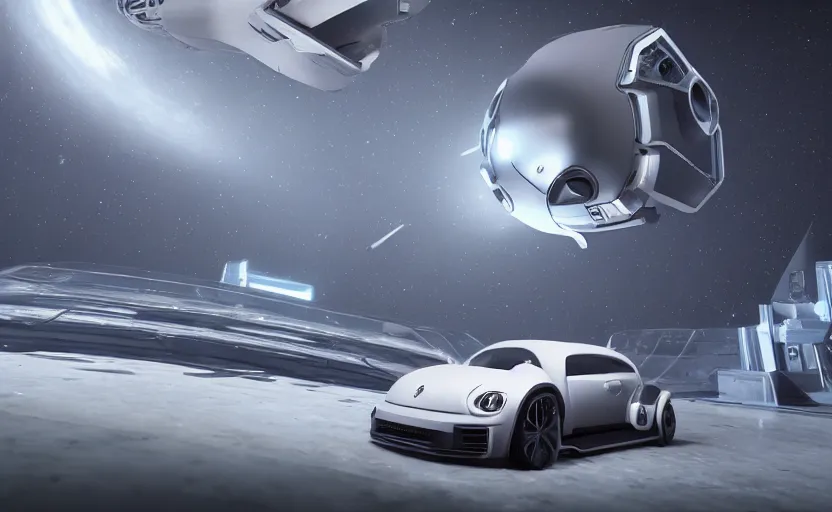 a spaceship version of the vw beetle floating in the space, masterpiece, hyperrealistic, futurist...Show more
