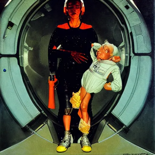 portrait of a woman with a bulky sci - fi jumpsuit in a dark and scary spaceship, by norman rockwell