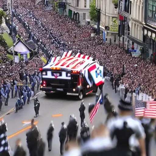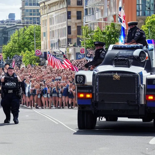 giant english bulldog with police escort at parade, live footage, 4 k