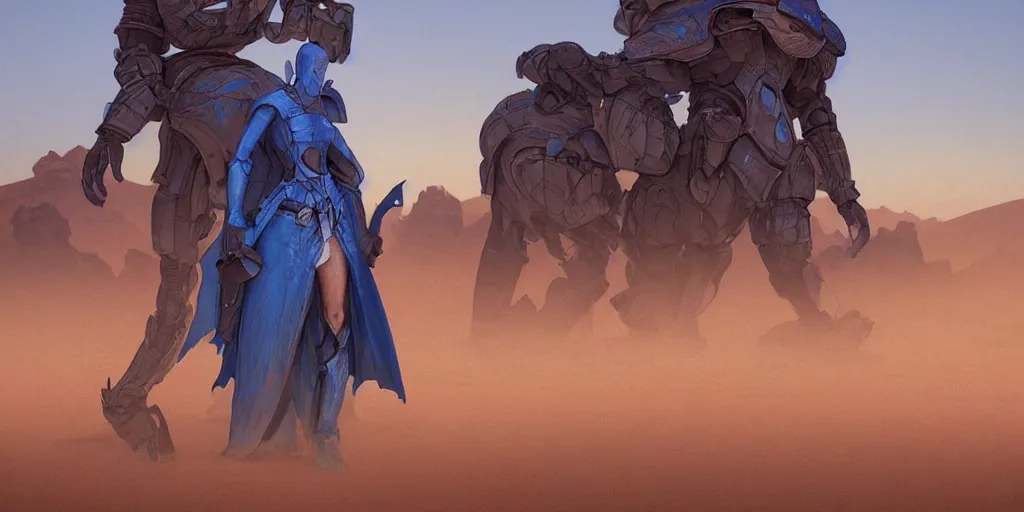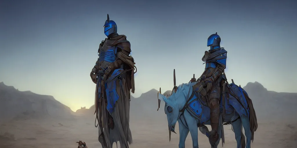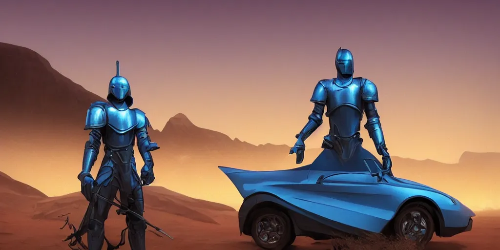 blue knight in desert standing next to car, misty blue hour, sci fi digital painting, unreal engi...Show more
