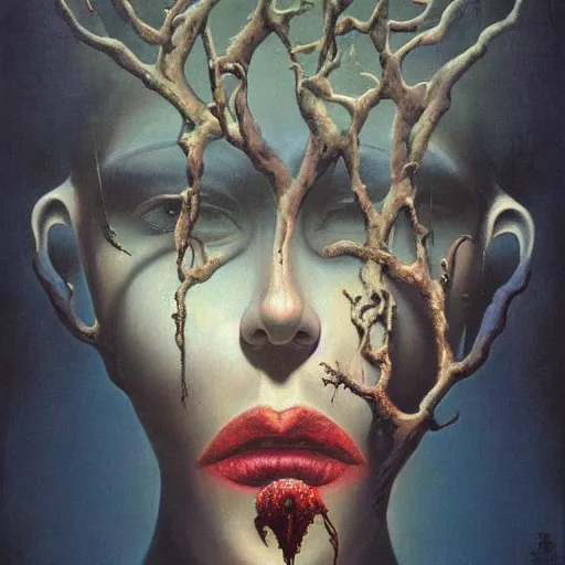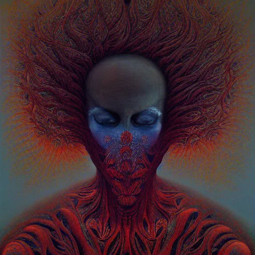 dramatic portrait painting of woman with black mandelbrot fractal instead of face, in style of zdzisław beksinski, horror, body horror, dark, disturbing,
