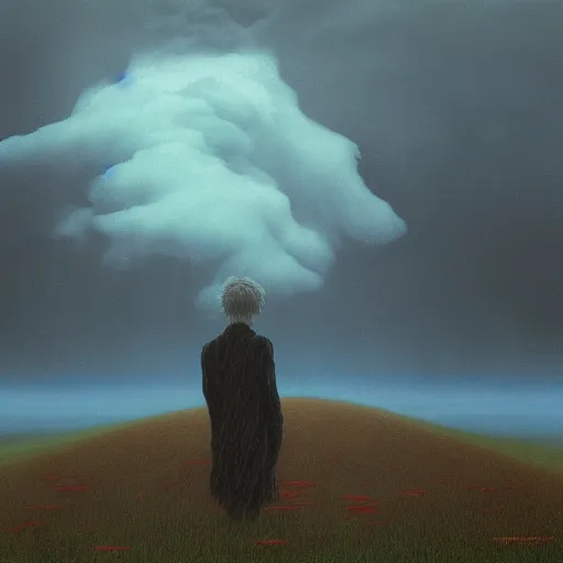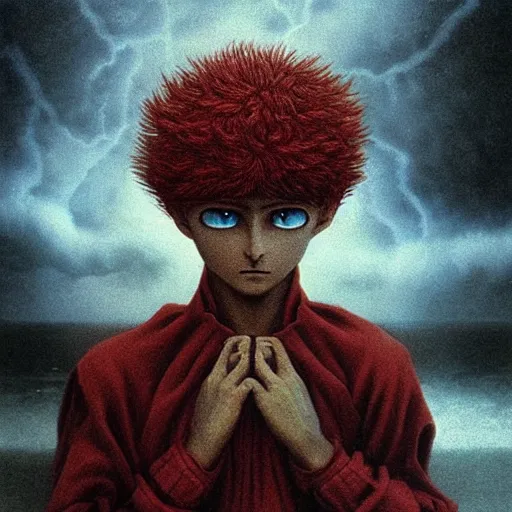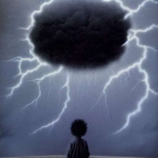 killua zoldyck made by zdzisław beksinski, thunderstorm, 8 k, detailed, cinematic, rain, crying,