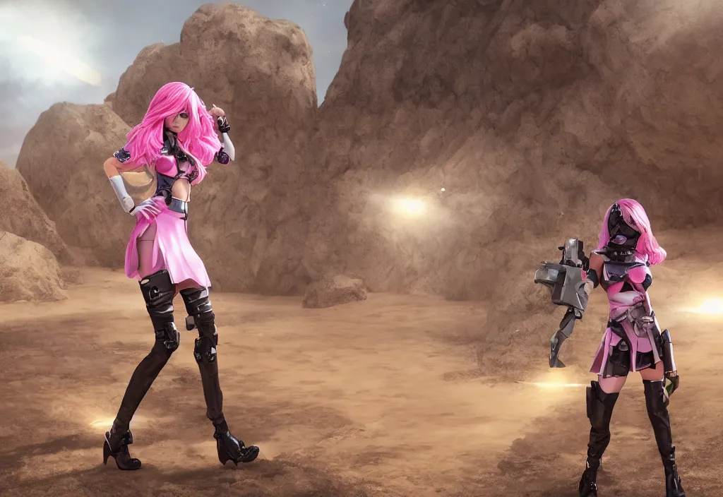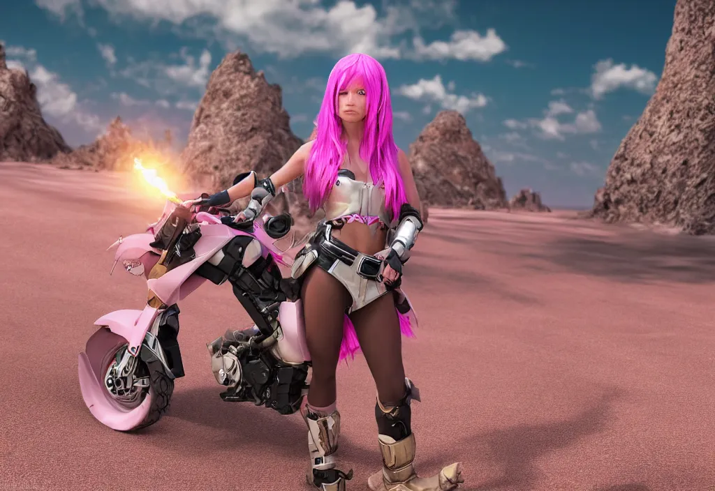 cosplay pink haired, tanned colombian, solo female character, light platinum armour, miniskirt, d...Show more