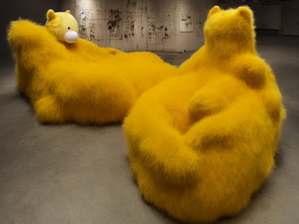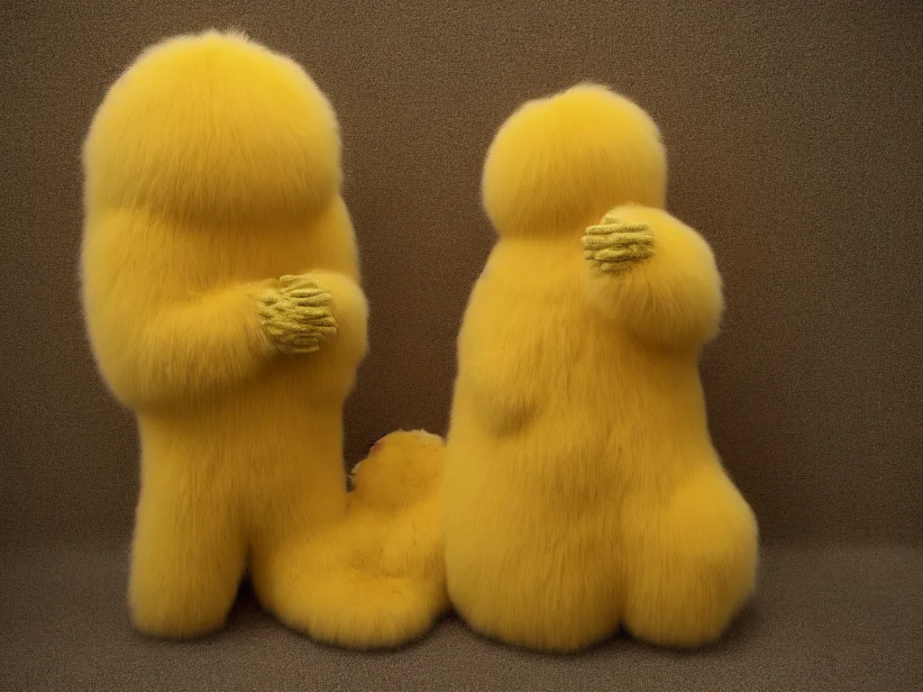 a fur covered jelly bean shape, dirty grungy stuffed animal, style of paul mccarthy and mike kelley, yellow - tan color