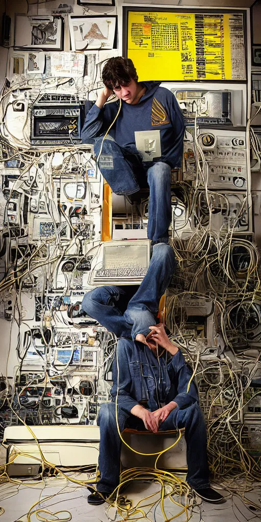 typical cryptocurrency nerd, sitting in front of old 9 0's computer, prominent yellow bitcoin pos...Show more