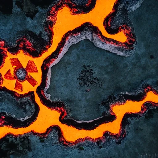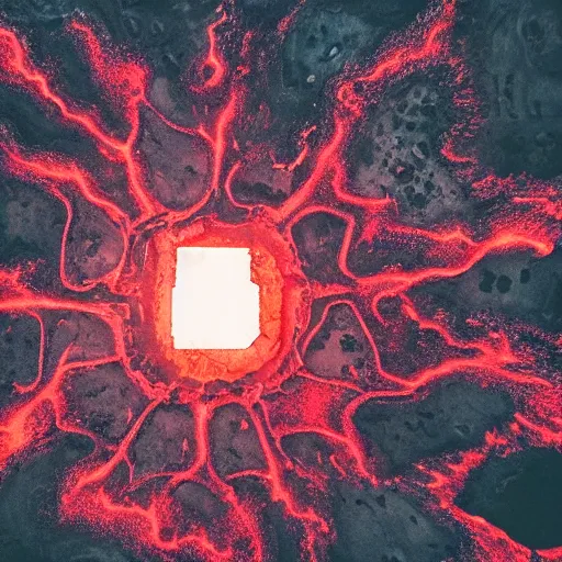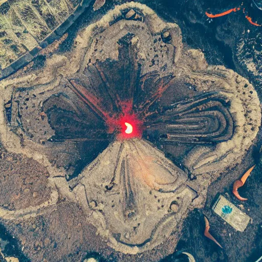 ancient demon summoning, magic, volcanic acitvity, shot from drone, intricate abstract