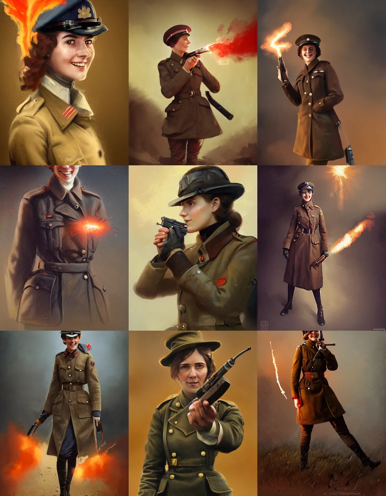 young female ww 1 officer, trenchcoat, firing a flare gun, smiling, digital portrait by greg rutkowski, intricate, soft focus, highly detailed, cinematic, epic, artstation