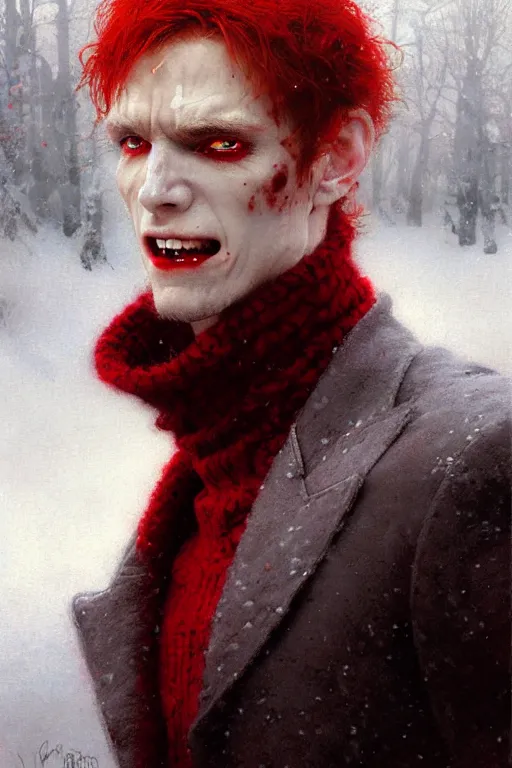 vampire with red eyes and red hair in a white woolen turtleneck portrait dnd, painting by gaston bussiere, craig mullins, greg rutkowski, yoji shinkawa