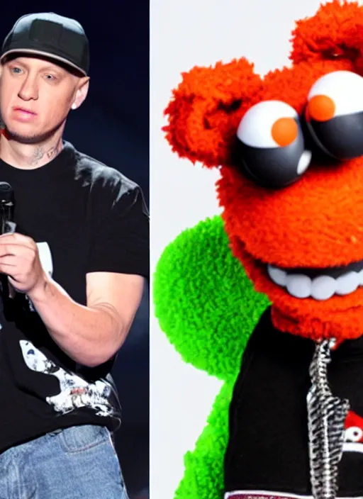 photo of eminem as a muppet with a microphone