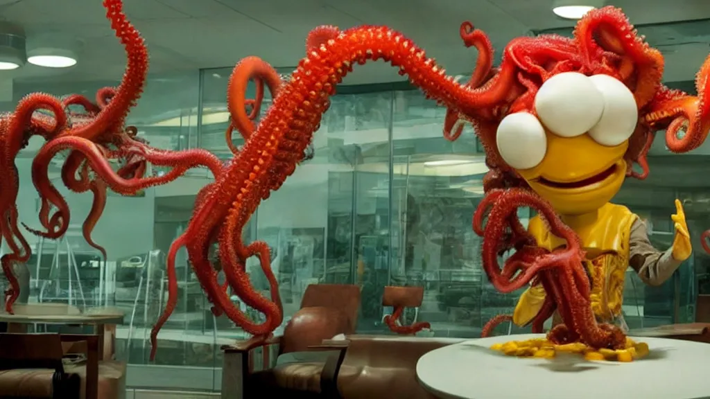 ronald mcdonald, mixed with an eldritch horror monster, with mechanical tentacles, in a mcdonalds lobby, film still from the movie directed by denis villeneuve with art direction by salvador dali