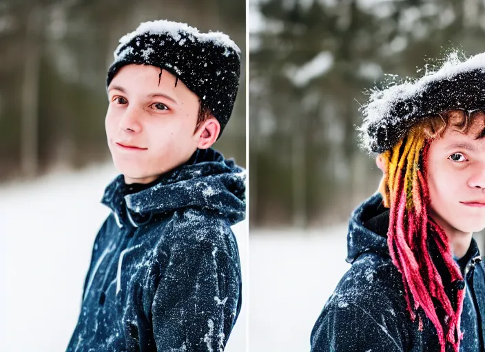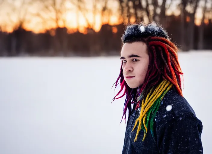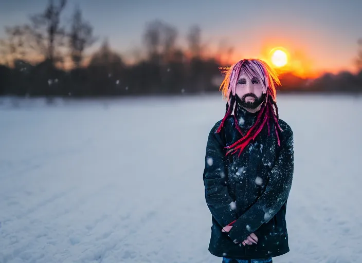 dslr photo portrait of a boy, with colored dread hair in snow, sunrise, 8 k, 8 5 mm f 1. 4