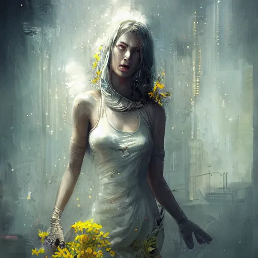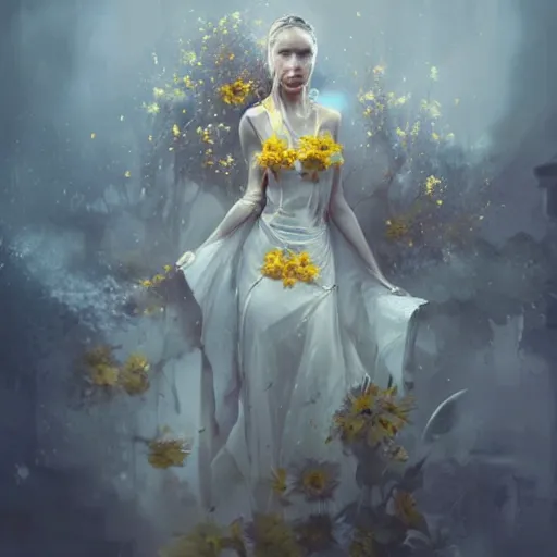 a woman in a white dress with yellow flowers on her body, cyberpunk art by bastien lecouffe - deharme, trending on cgsociety, fantasy art, dystopian art, apocalypse art, rococo