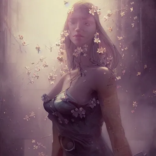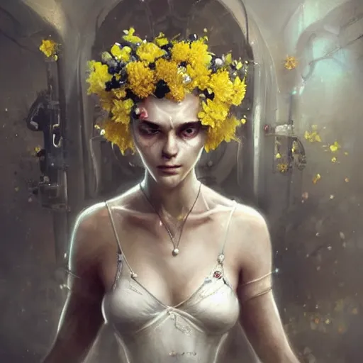 a woman in a white dress with yellow flowers on her body, cyberpunk art by bastien lecouffe - deh...Show more