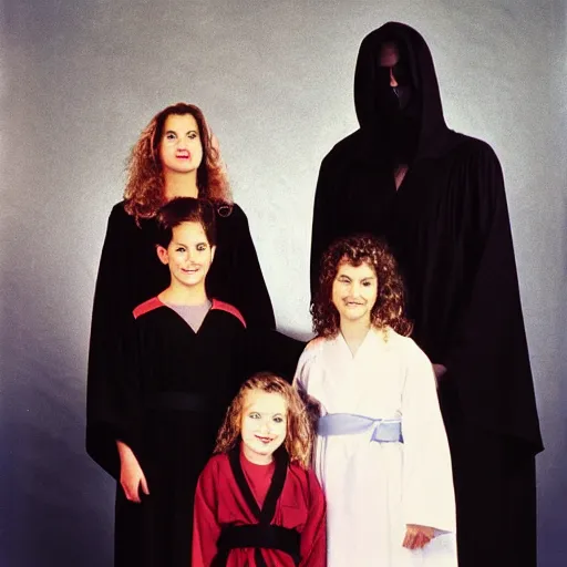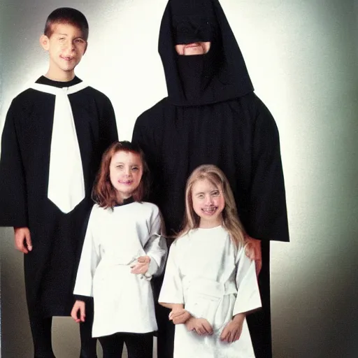 1 9 9 0's sears portrait photo, a family wearing long black cult robes and a giant evil sinister demonic creature