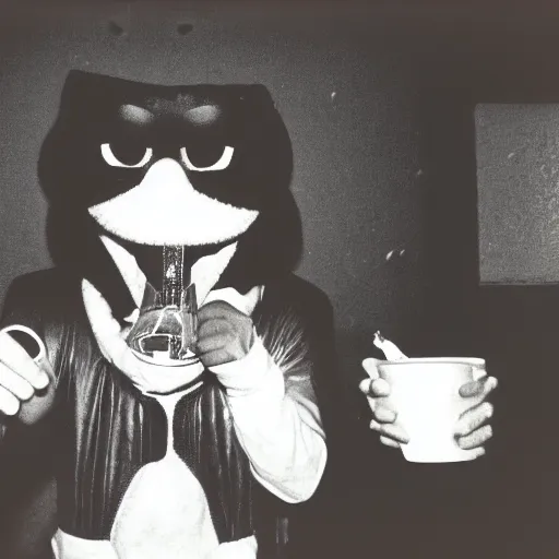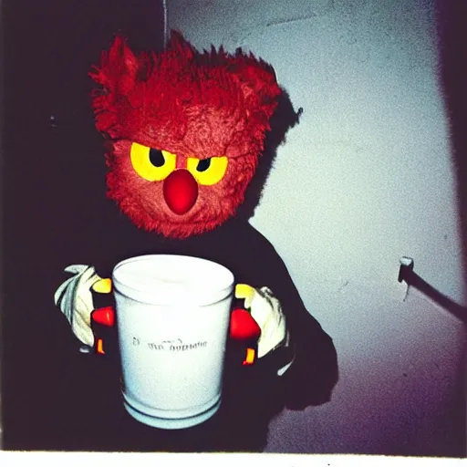 disposable camera flash photo of elmo sniffing powdered sugar through a straw in a dark night club bathroom