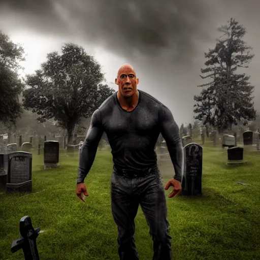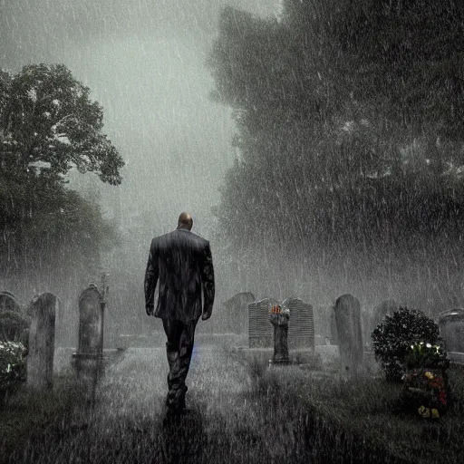 dwayne the rock johnson visiting a graveyard in the rain, sad feeling, photorealistic, moody lighting,