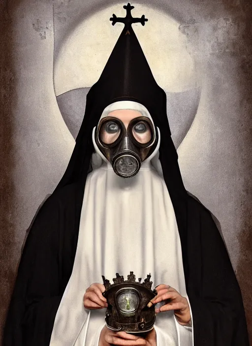 highly detailed closeup portrait of a goth medieval nun wearing a crown and a gas mask sitting on...Show more