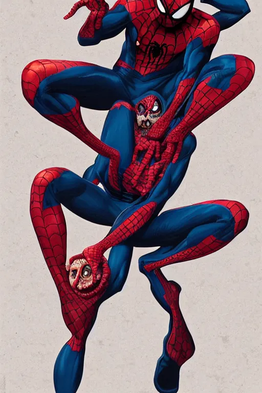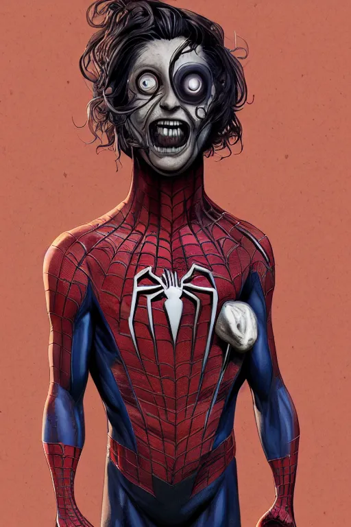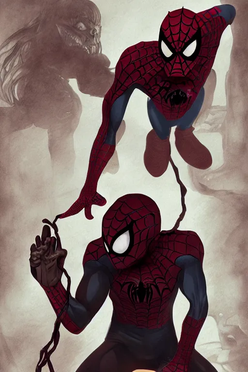 spiderman in sleepy hollow, full body, big two toned eyes, teeth gritted, horror, intricate details, cinematic, epic, realistic, anatomy, tomer hanuka, uplight, artstation, photorealistic, scary