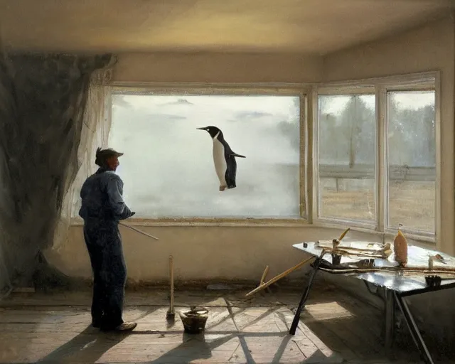 an exhausted painter in his studio painting a picture of a penguin - key lighting, soft lights, f...Show more
