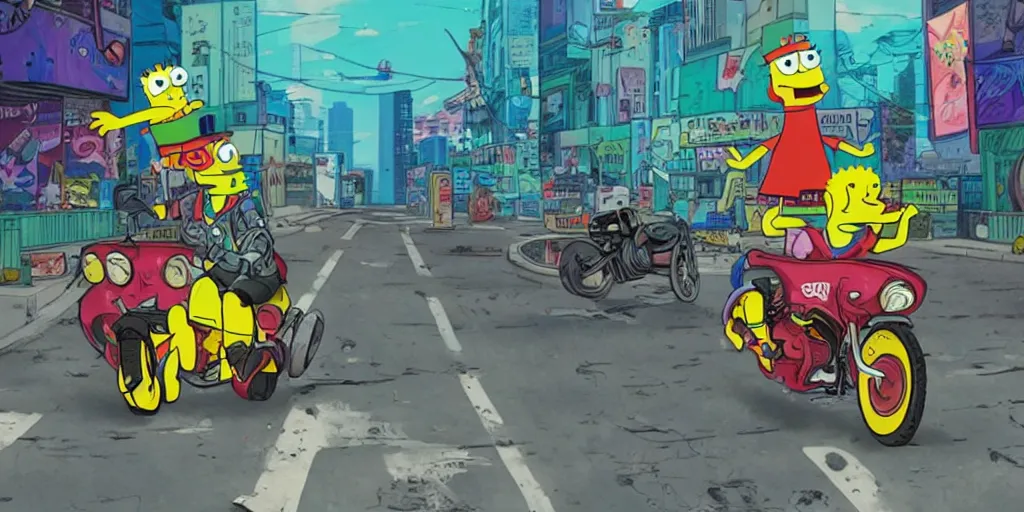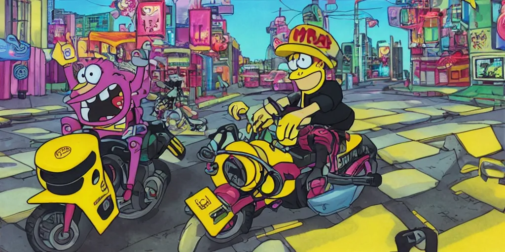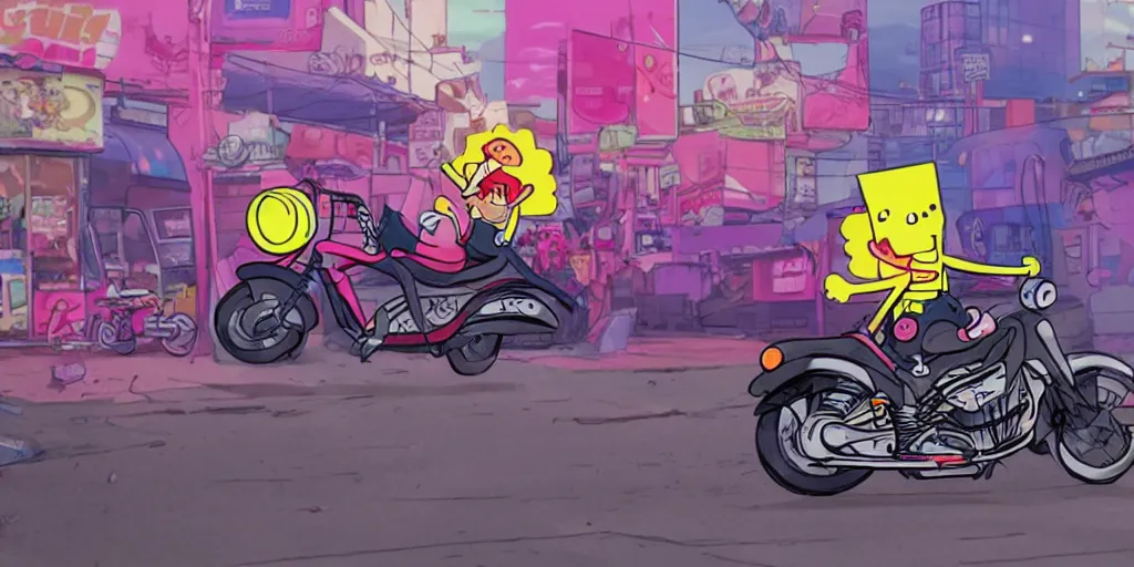 sponge bob akira, riding a motorcycle on the neonpunk street.