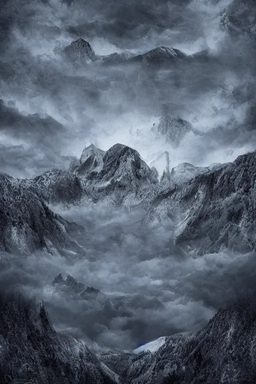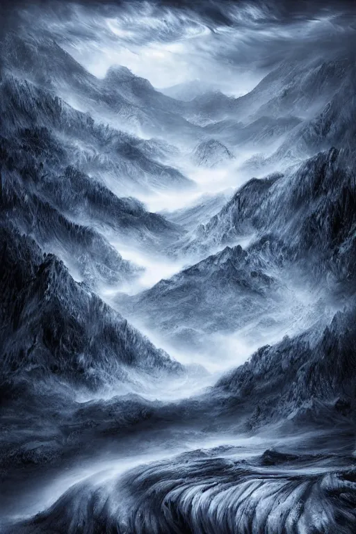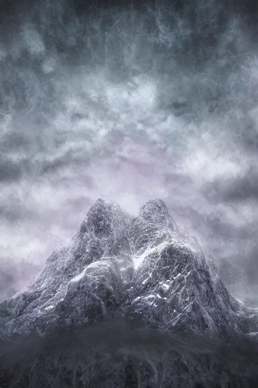 digital matte fantasy dreamy mountain scape dark tones snow, photo realism, soft, storm, 8 k by alex grey