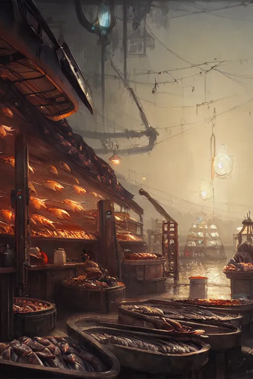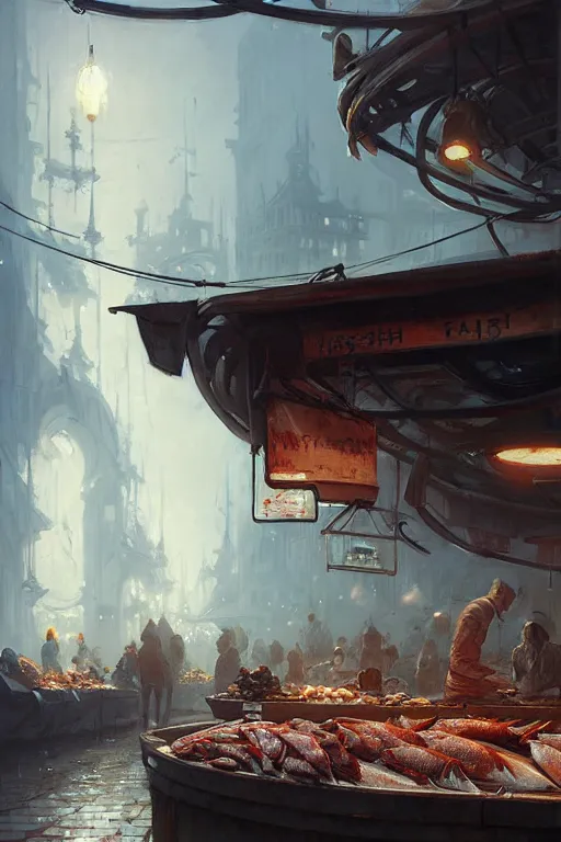fish market by bayard wu, anna podedworna, greg rutkowski, giger, maxim verehin