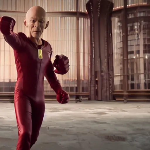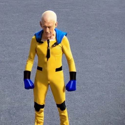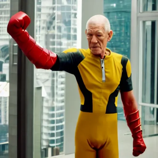 film still, full body action shot of ian mckellen playing saitama dressed in the one punch man costume