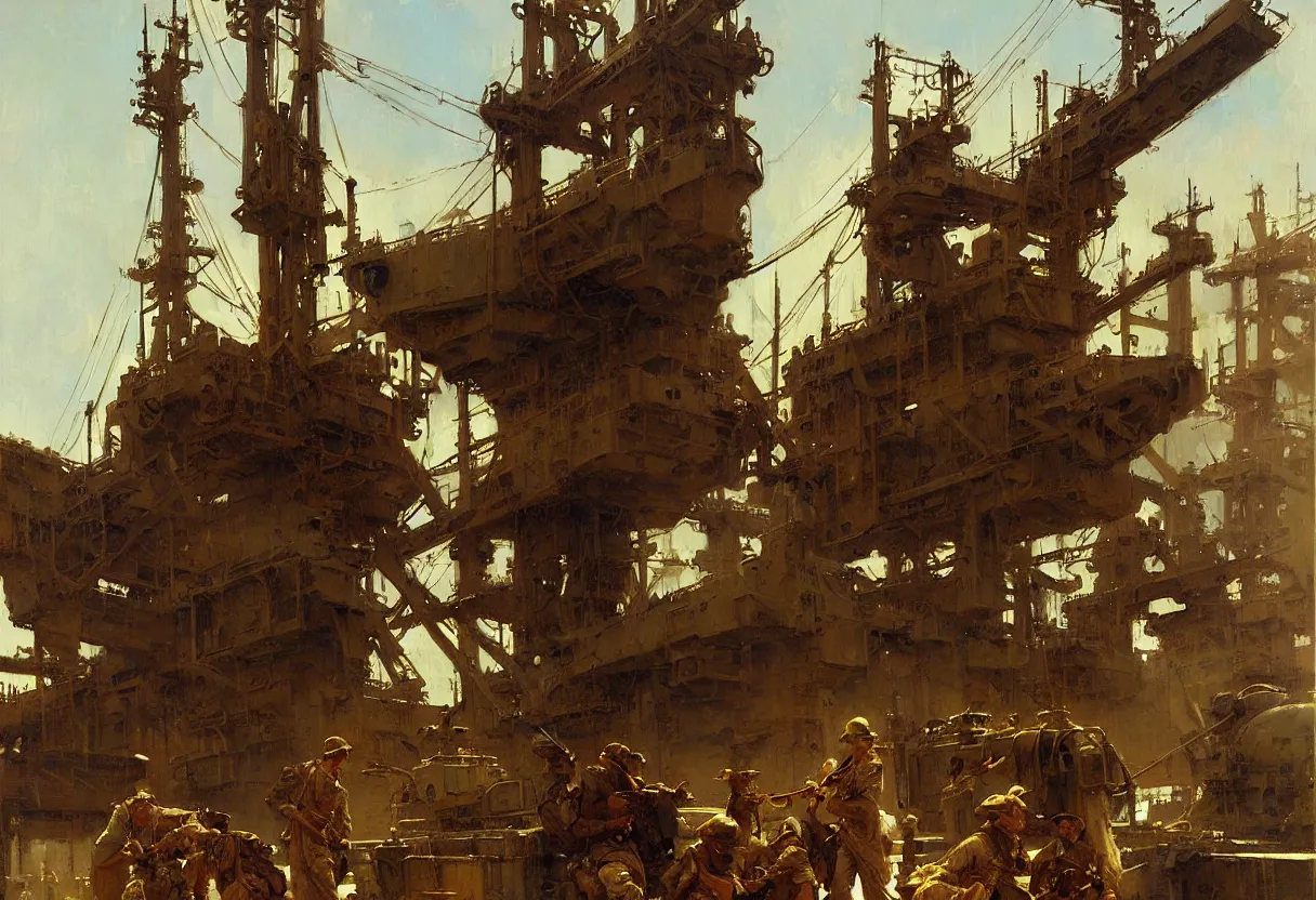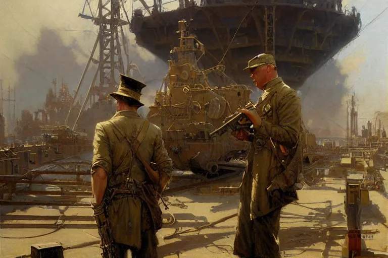 us soldier in shipyard dieselpunk painting by gaston bussiere, craig mullins, j. c. leyendecker