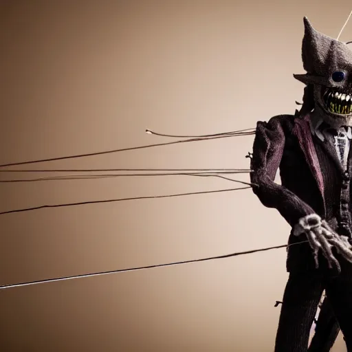 a highly detailed, dark fantasy, sinister humanoid figure made out of strings, making a smile wit...Show more
