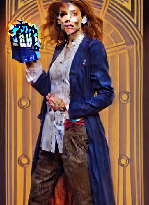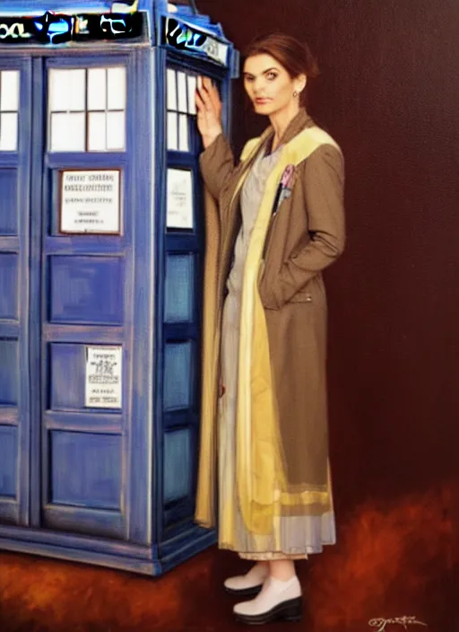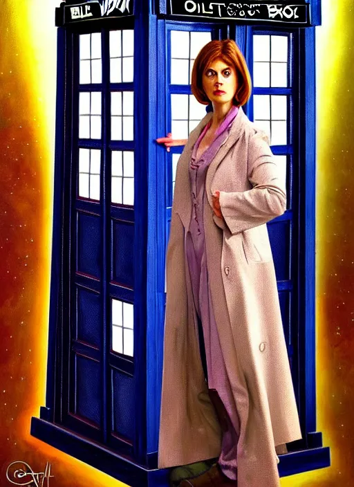 oil painting of the twelftg doctor from doctor who with her tardis, intricate, elegant, highly detailed, lighting, painting, artstation, smooth, illustration, art by greg rutowski and alphonse mucha