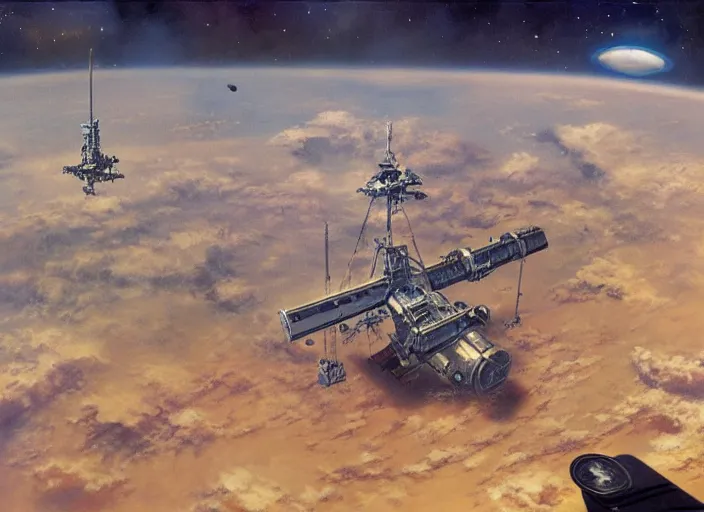 abandoned space station drifting in empty space, matte painting, peter elson, chris foss