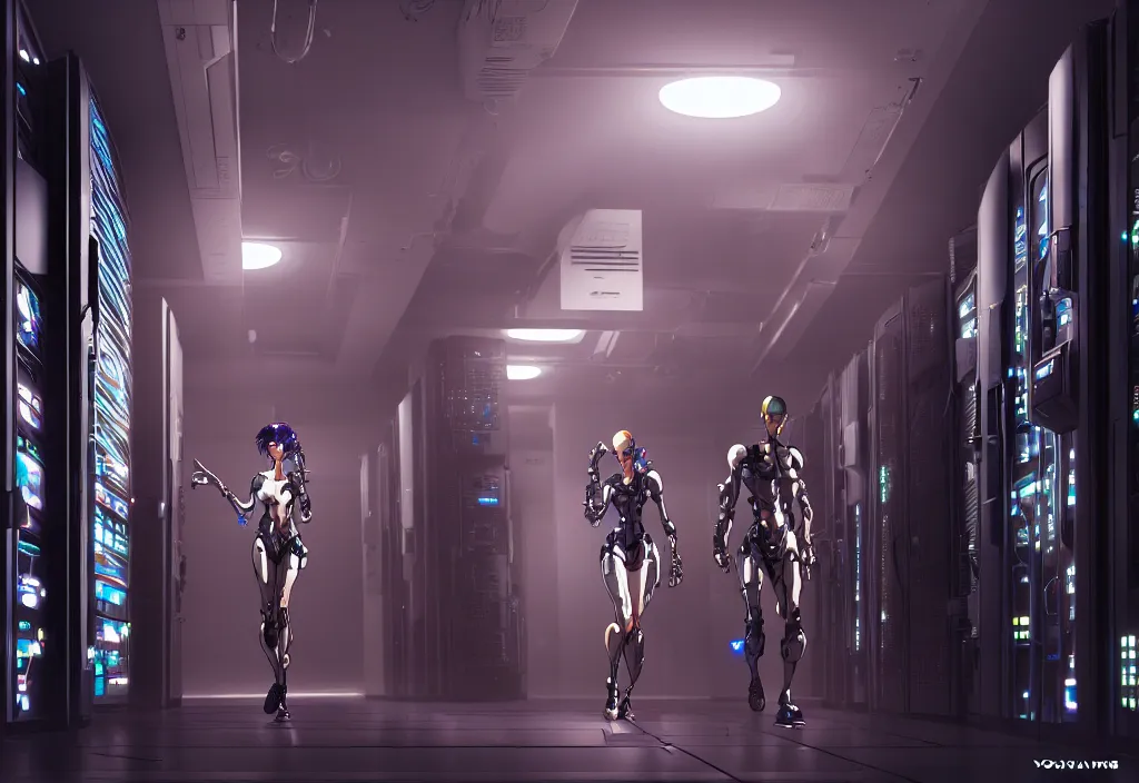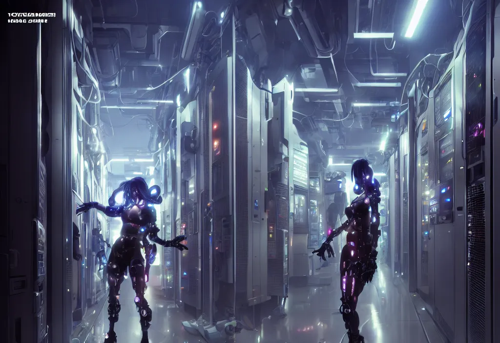 shot of film by cyberpunk syle cyborg walking in server room in datacenter, character design, by...Show more