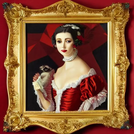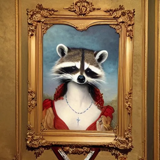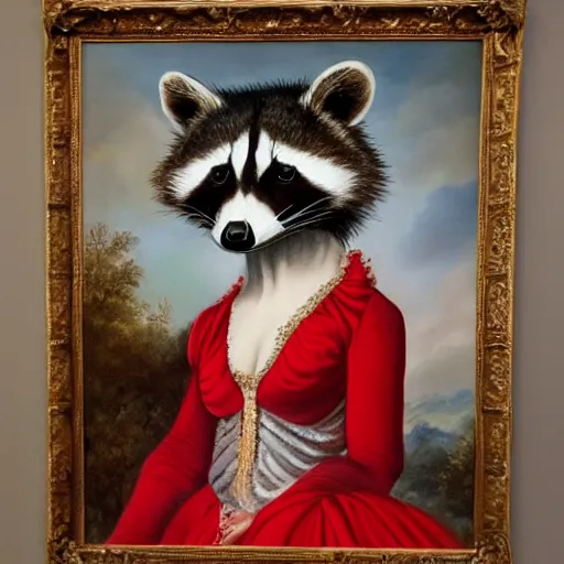 a majestic oil painting of a raccoon queen wearing red french royal gown. the painting is hanging on an ornate wall decorated with wallpaper.