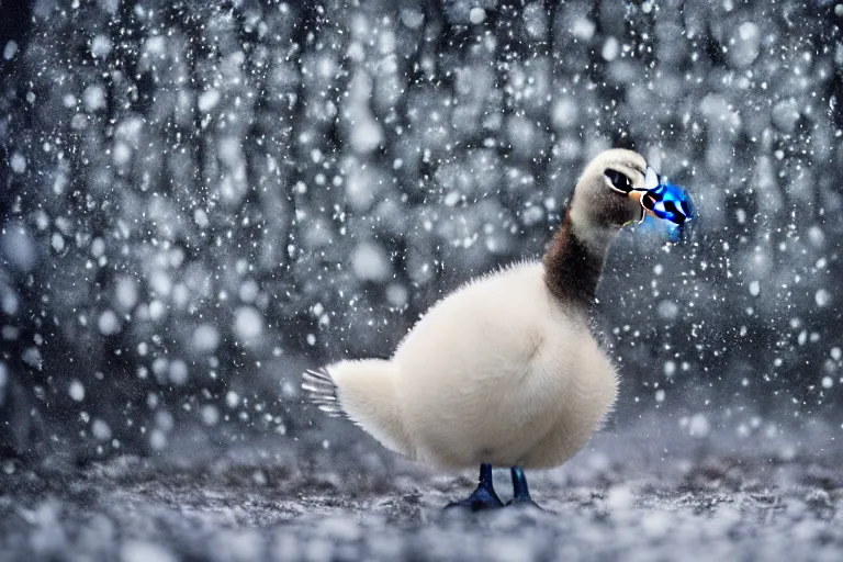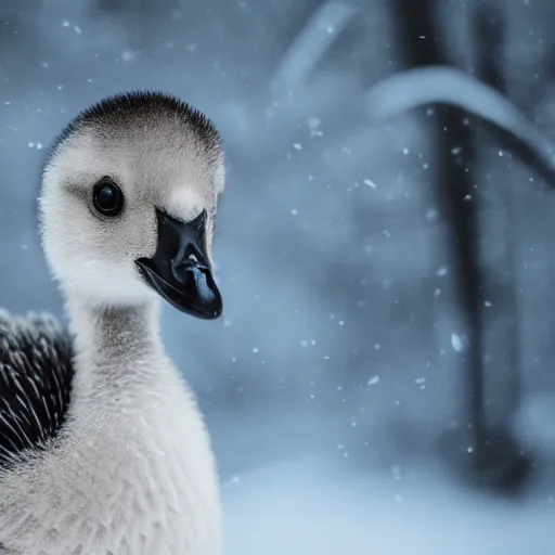 closeup of cute baby goose in mystical magic snowy forest, award - winning photograph, cinematic scene, studio lighting, hyperrealism