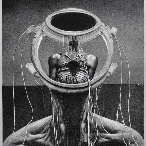 alien kept in a holding tank, wires hooked up to body, dark and mysterious science lab, highly detailed beksinski painting