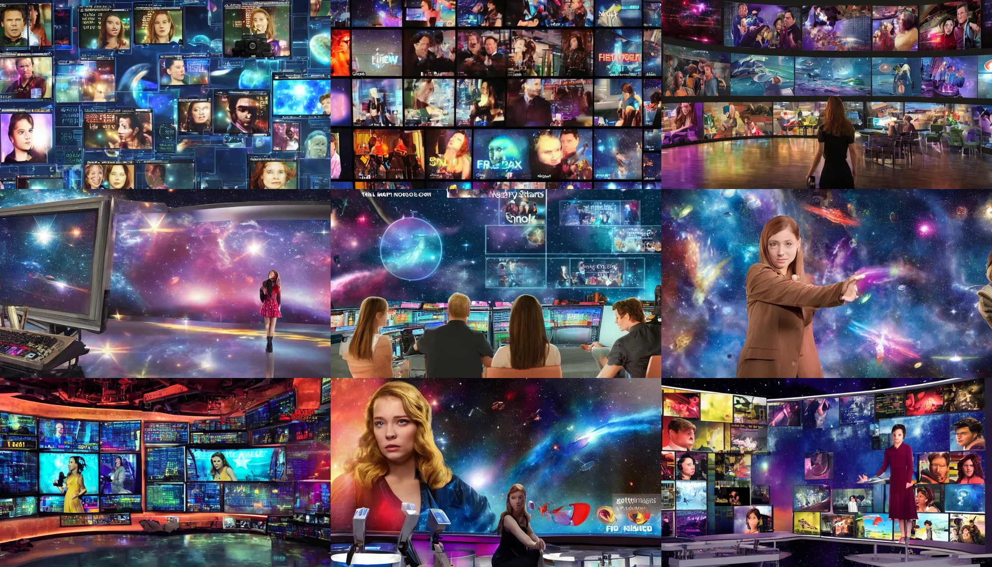 screen of holo - proector shows a evening news program, girl telling news, stockexchange bar, in...Show more