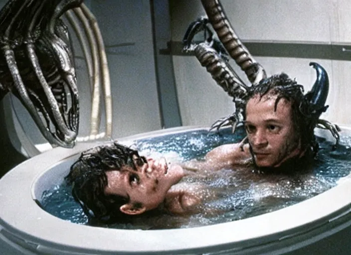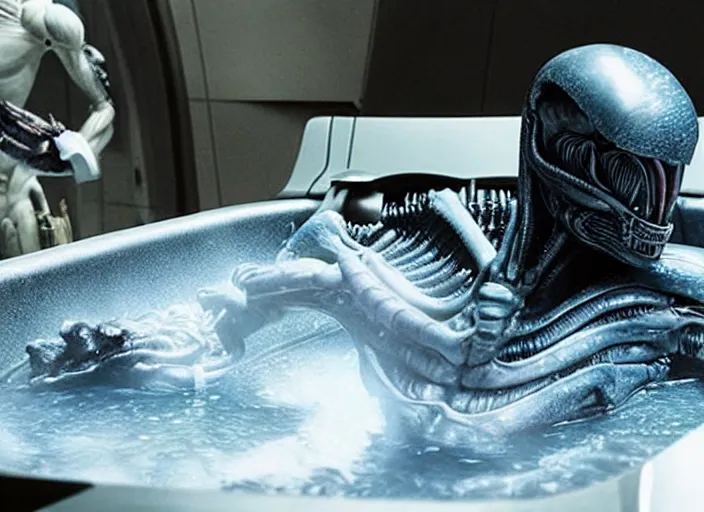 film still of alien!! xenomorph!! relaxing in a hot tub in the new alien movie, 4 k