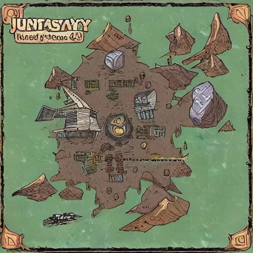 an illustrated fantasy map of a small outpost. junk planet. d & d. clear design. minimal.
