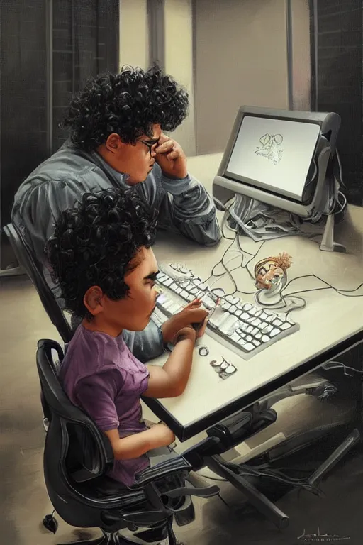 painting of a young chubby mexican man with curly hair sitting at his work desk with an incredibly fancy mechanical keyboard, by artgerm and yoshitaka amano, trending on artstation