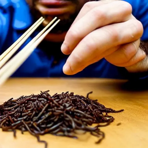 a man eating earthworms with chopsticks
