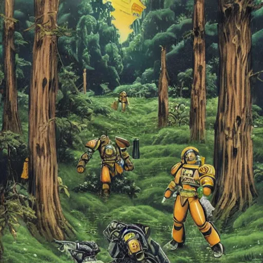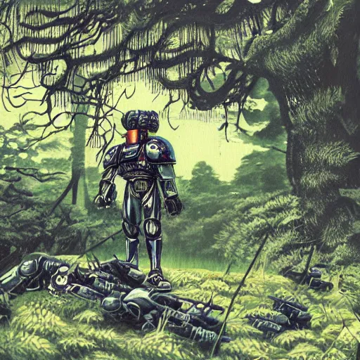 japanese, imperium space marine, lush pastoral woodland scene, pulp science fiction illustration