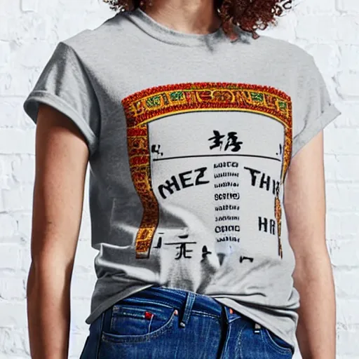 Prompt: a t shirt with unique design in a hanger in front of a brick wall, warmly lit photograph, product photography