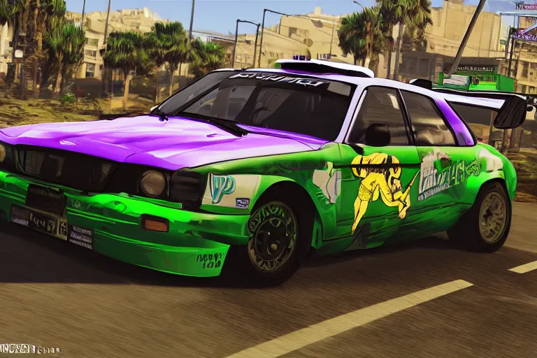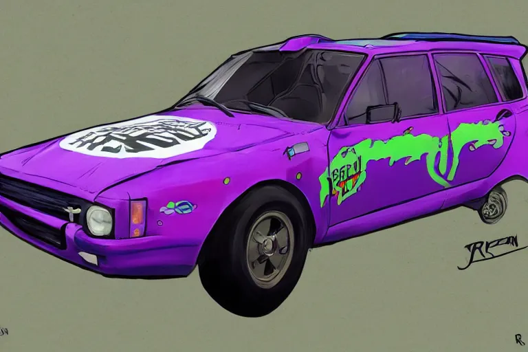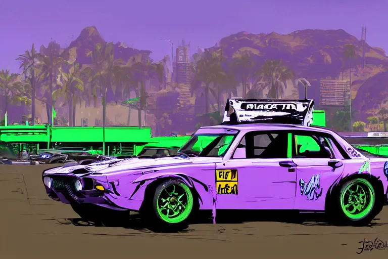 purple and green wrc snakeoil livery rally car, gta 5 stylized, official fanart by jesper ejsing, by wlop, frank frazetta and r. crumb