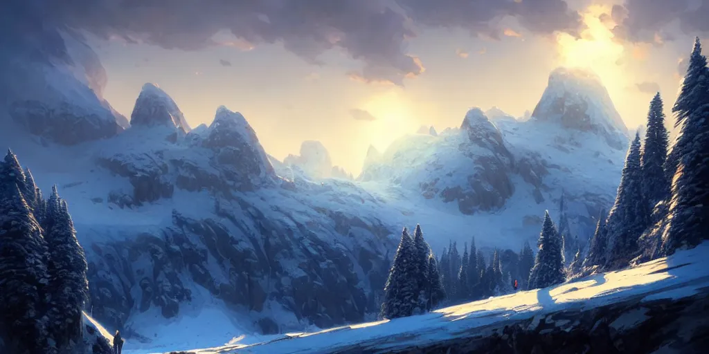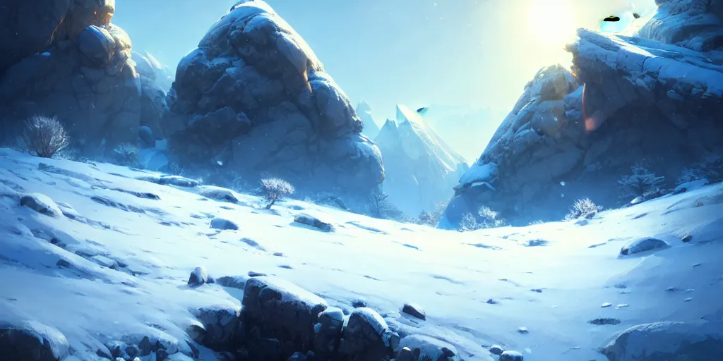 snowy mountain landscape, cinematic view, blue sky, detailed, concept art, low angle, high detail...Show more